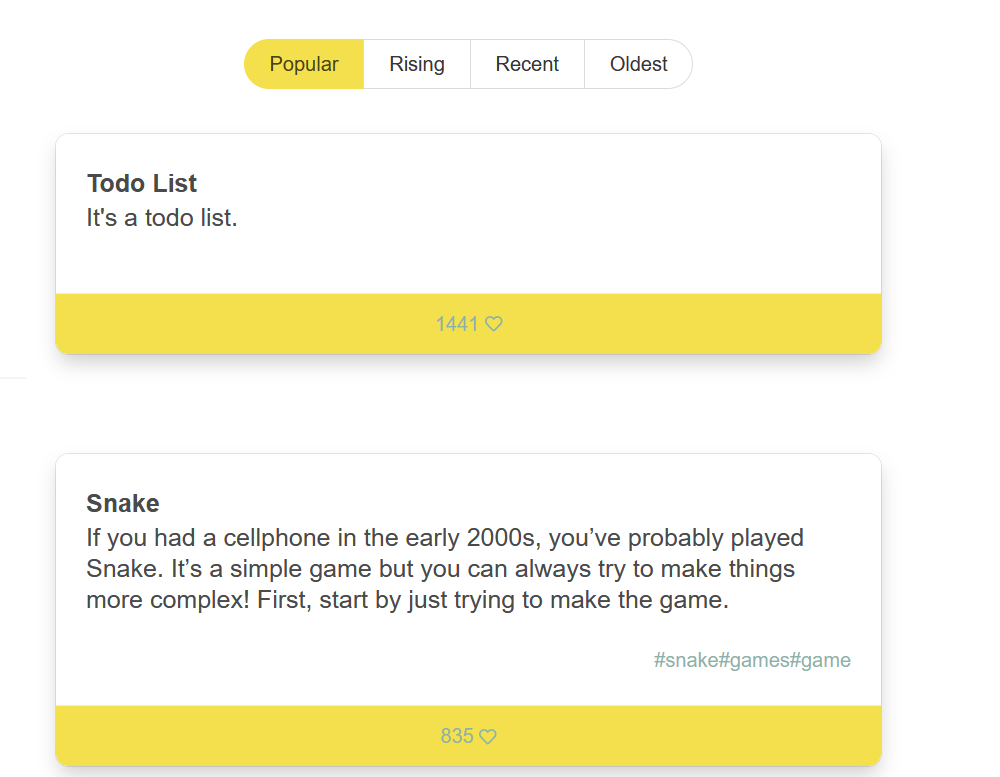 Ce dernier propose un certains nombre d’idées, des plus simples aux plus farfelues, d’application à réaliser pour mettre en pratique ses connaissances. Avec un système de tri à la reddit (Top, New, Rising..) l’interface simple et efficace est assez agréable à utiliser, une bonne découverte !